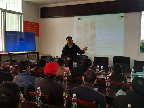 培训会上,李洪雯博士围绕甜樱桃早结丰产的环境因素、甜樱桃优新品种选择、优质种苗的培育、高效栽培的关键技术、肥水科学施用技术、芽果后期管理技术、裂果现象处理和病虫害防治技术等方面,用通俗易懂的语言详细地为参会人员开展了知识技术培训。培训过程中,李博士还不时与农户进行交流,耐心细致地解答种植户们在种植过程中遇到的困惑,原计划一个半小时的培训延迟到了三个多小时。